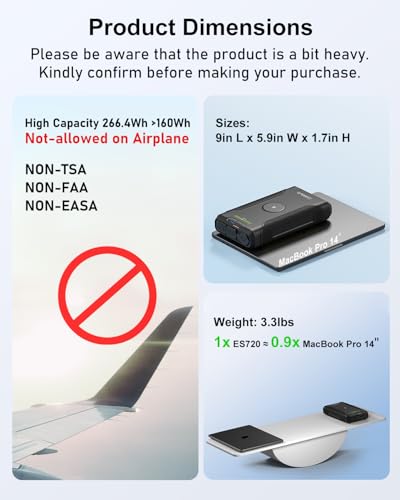 72000mAh 266Wh High-Capacity: Long-lasting running time! You can easily have a few nights of relaxing sleep with your CPAP machine while camping or RVing. Tip: Turn off the heater & the humidifier for extended runtime. Tip: ES720 is Not TSA-approved, and can’t be taken on board