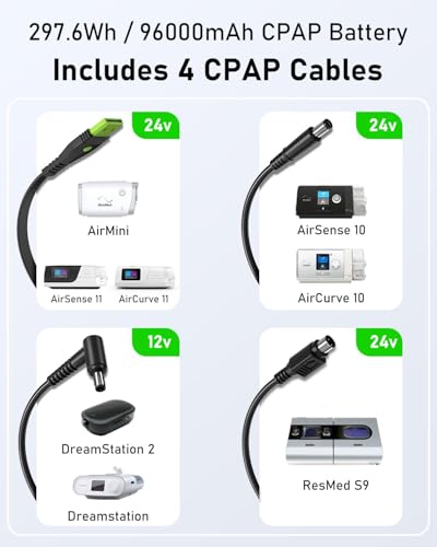 CPAP Battery with Cable: Package comes with 4 pcs CPAP charge cables and 4 adjustable DC output voltages: 12V, 16.5V, 20V, and 24V, ES960 compatible with ResMed AirSense 11, ResMed AirSense 10, Aircurve 10, Aircurve 11, ResMed AirMini, ResMed S9, Philips DreamStation, Philips DreamStation 2