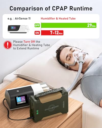 96000mAh/ 297.6Wh CPAP Battery for Camping: Large capacity CPAP battery helps you sleep easily for multiple nights while camping or RVing. Note: Please turn OFF the heater and humidifier for extended runtime. Tip: Non-TSA, Non-EASA, can’t be taken on board