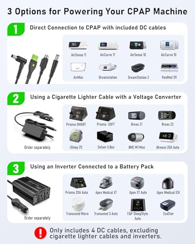 How to Charge Other CPAP Models: Connect the ES960 CPAP battery to an inverter via the cigarette lighter socket, can be compatible with nearly all CPAP machinery on the market, such as Löwenstein prisma smart series, Breas Z1, Z2, iSleep 25, Sefam S.Box, EcoStar, DreamStation GO, BMC M1 mini, Luna G3 Auto, ibreeze, Transcend 3 Auto, F&P SleepStyle Auto, Apex XT Auto etc